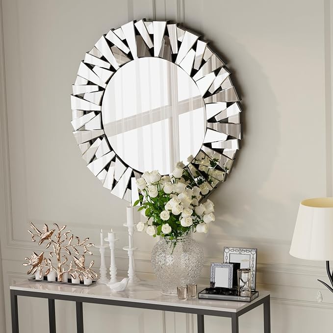 • Art Deco Style Round Glass Mirror - 32 inch Silver wall mirror can reflect enough natural light. Simple and modern design elements make it easy to integrate into various scenes, such as living room, dining room, bathroom or corridor. The mirror has an art deco style that can add some glamour and sophistication to your room