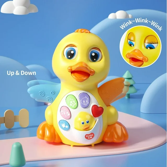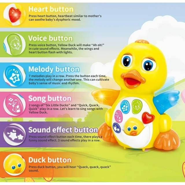 • MULTIPLE PLAYING MODES: This yellow dancing duck Includes 5 buttons in front of its body. Playing several melodies, the sounds is designed to imitate the authentic voice of duck. For example, when you press the red heart button, it can play the heart beats; You also can press the head of the baby duck which is in the pouch of the big duck; Press other buttons to make the duck dance, blink, swing, walk and sing;