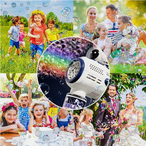 Automatic & Build-In Blue LED Light -The automatic bubble machine will make your little angel no longer need to blow the bubbles tiredly and say goodbye to the trouble of needing to constantly dip in the bubble liquid. Bubble machine also with build-in blue led light, will super cool in night playtime.