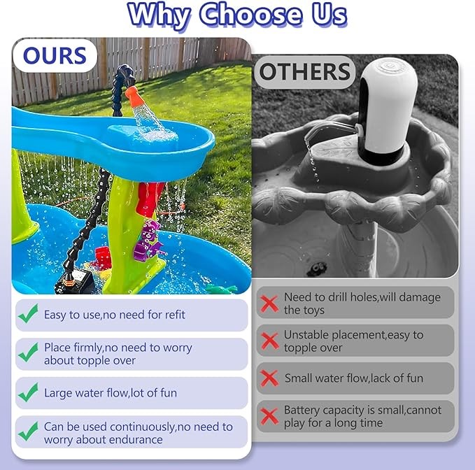 【A great gift for children】:This water pump is an essential accessory for kids water table,continuous flowing water can make kids water table toys more interesting,which can increase children's fun of playing and cultivate their hands-on abilities.If you have any questions about the quality and instructions during use,please contact us.